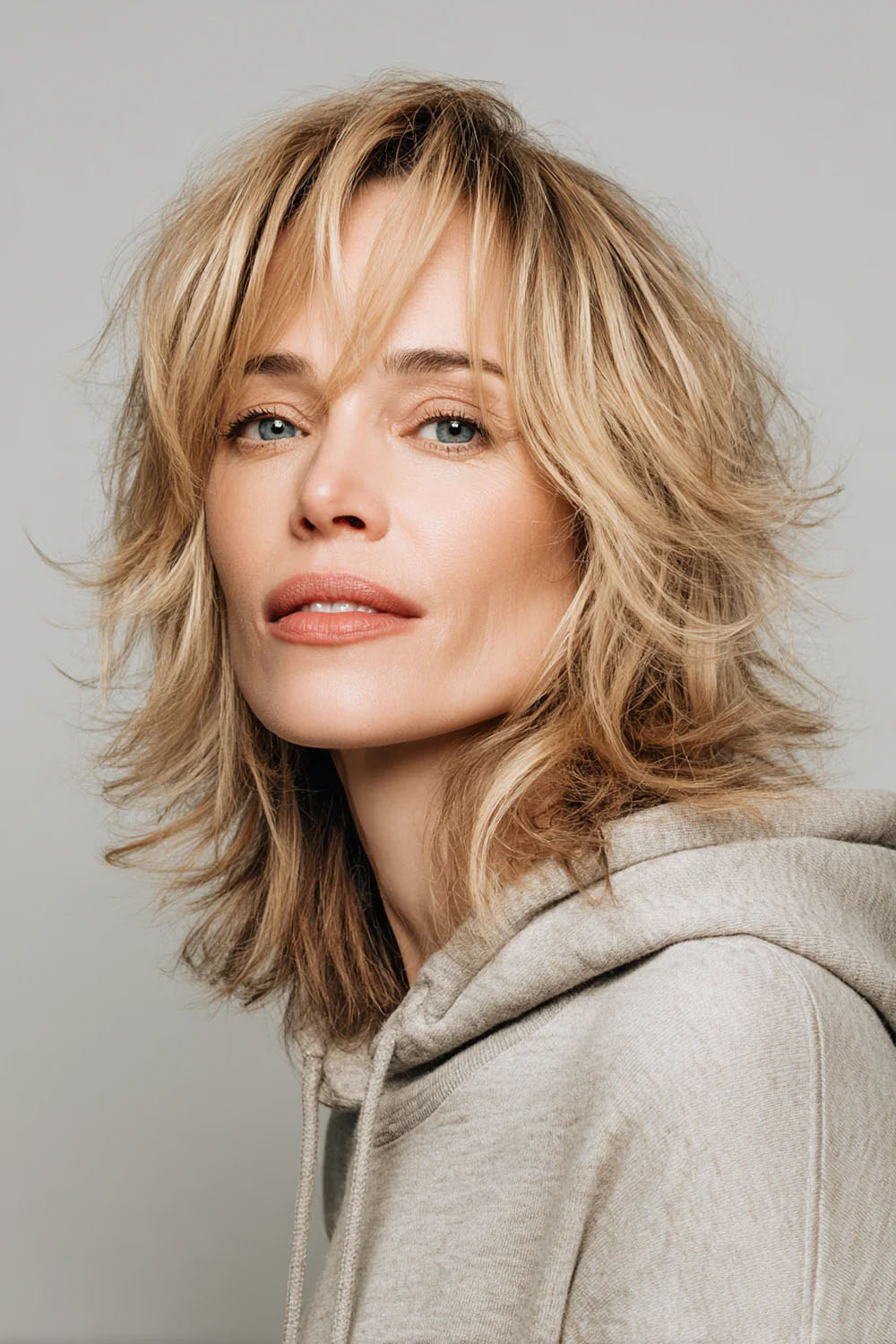 „Užuolaidėlių“ stiliaus kirpčiukai minkštai rėmina veidą ir sukuria „liftingo“ efektą ties skruostikauliais. Smėlinis blondas atrodo natūraliai ir subtiliai jaunina.