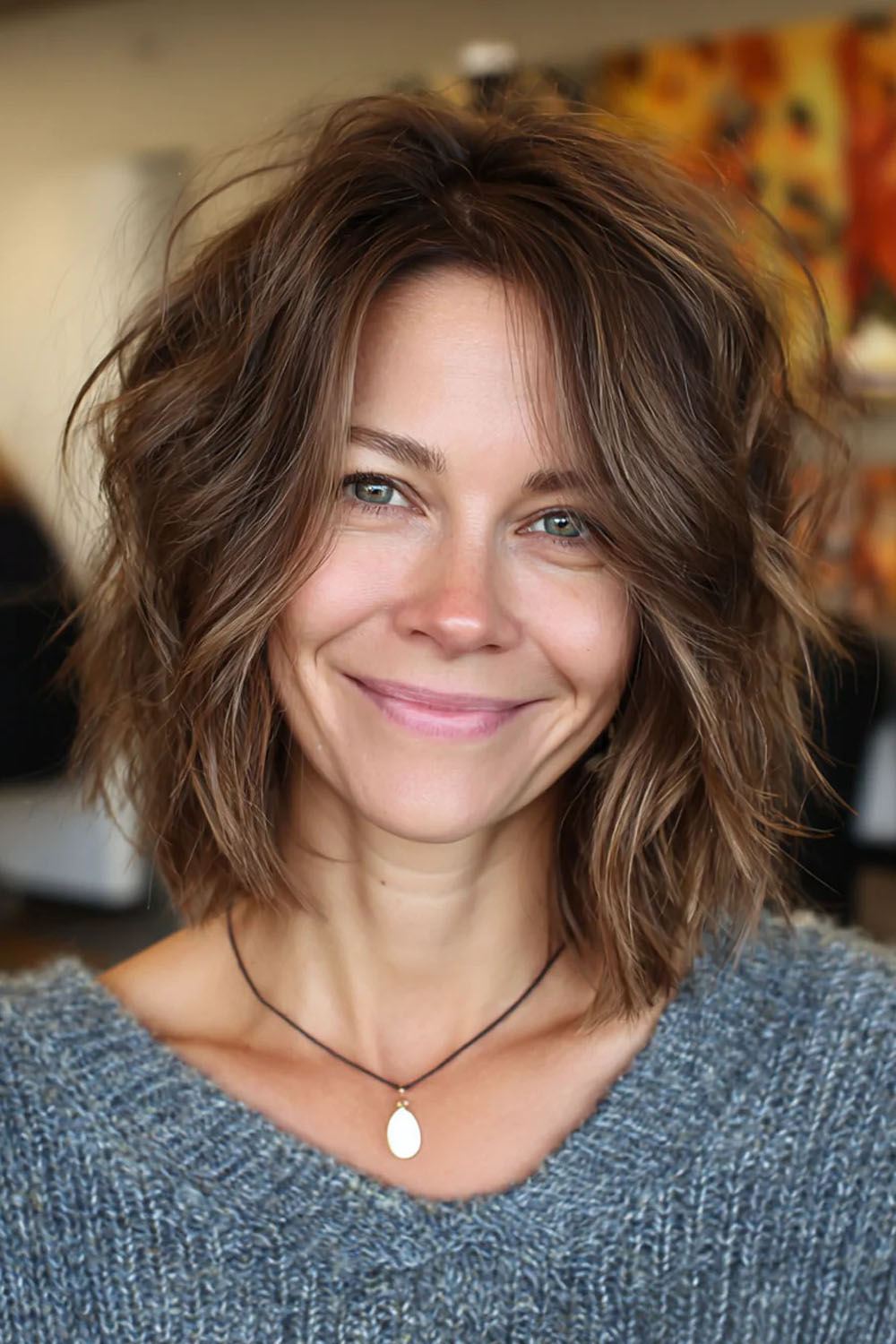 7) Tekstūrinis „long-bob“ su sruogomis prie veido, šaltas bėžinis kaštonas