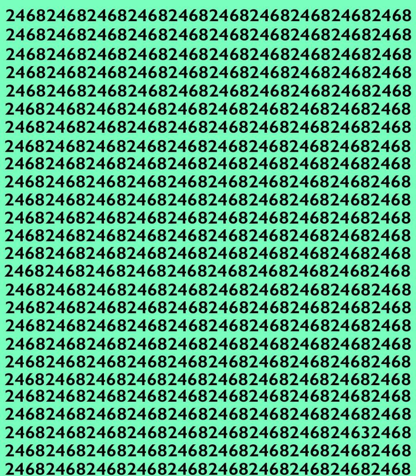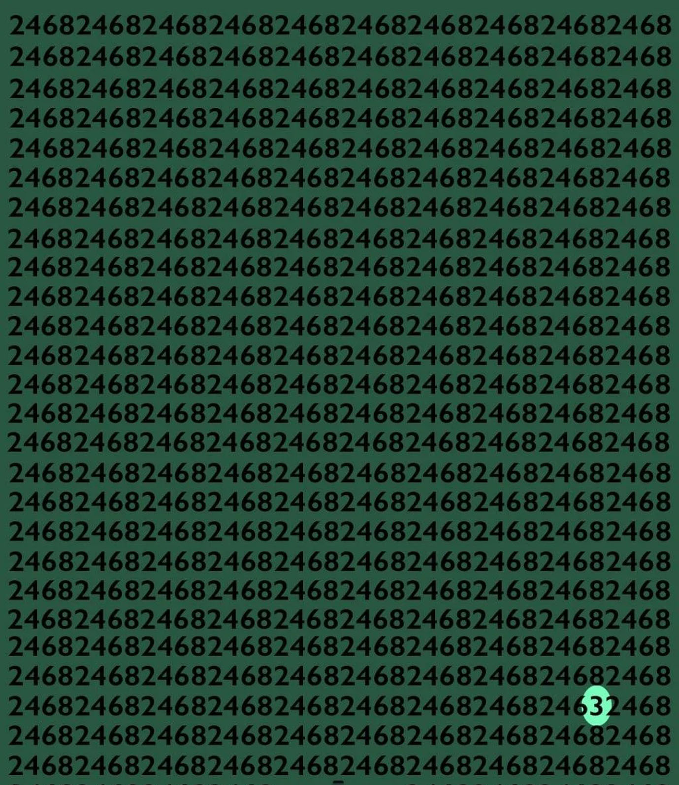 Žaliame fone skaičiai išdėstyti tokia tvarka: 2, 4, 6, 8 - ir taip ratu, eilutė po eilutės. Viskas atrodo monotoniška, tačiau kažkur tarp šių skaičių paslėptas vienas 3. Tavo užduotis - surasti jį per 10 sekundžių.