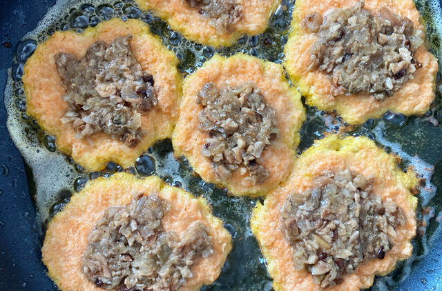 Keptuvėje įkaitinkite aliejų. Dėkite šaukštą tarkių, išskleiskite blyną ir ant vidurio – šaukštą grybų įdaro. Išlyginkite. Ant viršaus dėkite dar vieną sluoksnį tarkių. Išlyginkite. Vartydami iškepkite.