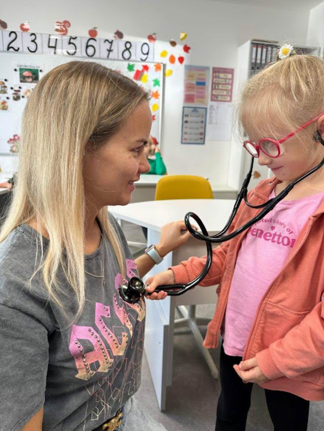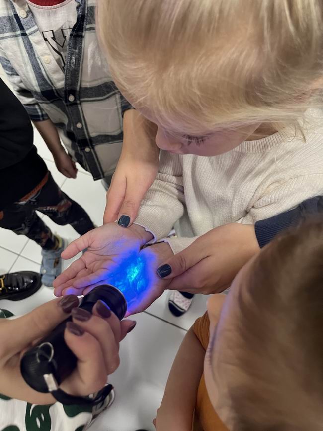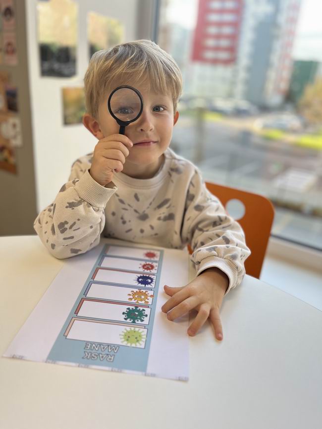 „Kalbant apie mikrobus ir rankų higienos svarbą, su pačiais mažiausiais darželinukais tampame mikrobų medžiotojais ir padidinamuoju stiklu bandome rasti visas klasėje esančias pasislėpusias bakterijas. Taip pat mokomės taisyklingai plauti rankas. Šioms veikloms į pagalbą pasitelkiame šviečiančius miltelius, kurie nudažo rankų mikrobus ir jie spindi specialioje LED šviesoje. Vėliau stebime, kiek šių mikrobų pašaliname tinkamai plaudami rankas.