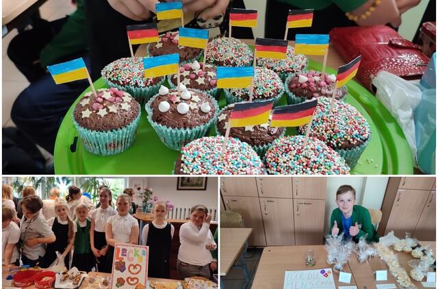Kadangi mokykloje dalis pamokų dėstoma vokiečių kalba, išradingi mokiniai savo keptus keksiukus puošė trimis vėliavomis: Vokietijos, Lietuvos ir Ukrainos.