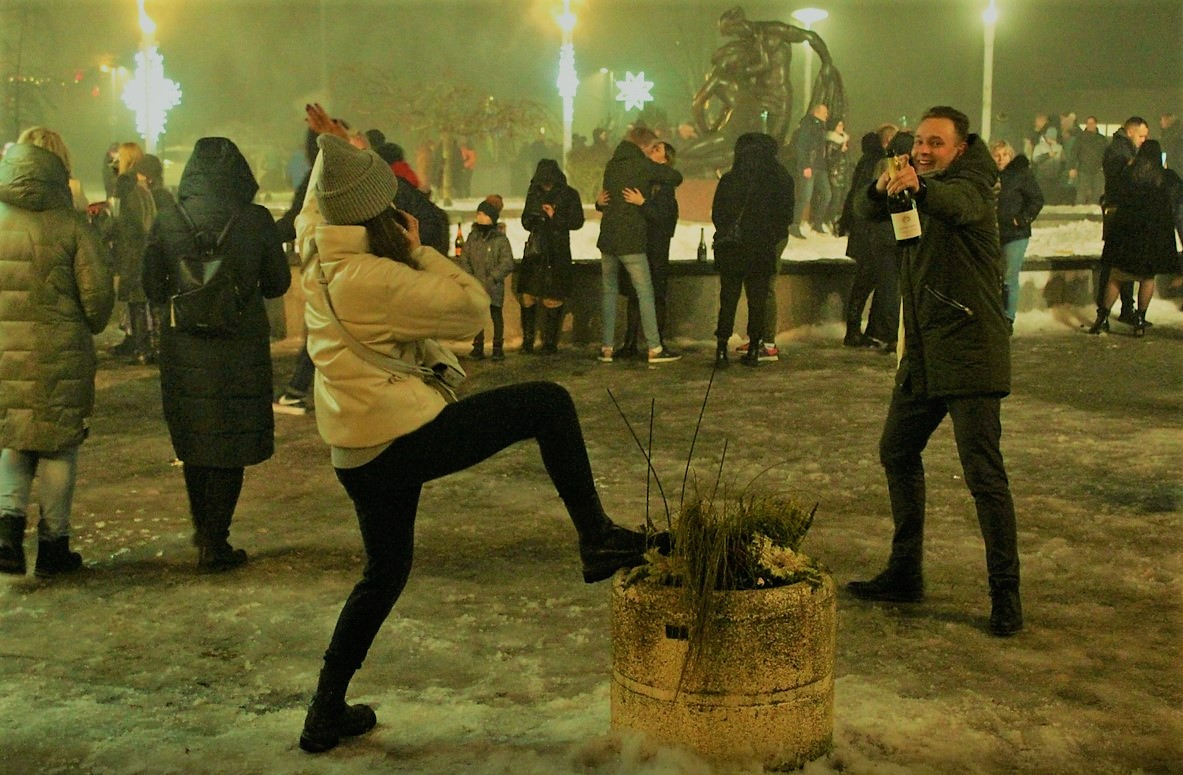 Paplūdimyje daugelis pasiruošė atsineštus pirktinius fejerverkus ir laukė vidurnakčio. Laikrodžiams mušant dvylika Jūratės ir Kastyčio skveras paskendo dūmuose, pokšėjo atkemšami putojančio vyno buteliai, publika glebėsčiavosi ir sveikino vieni kitus.