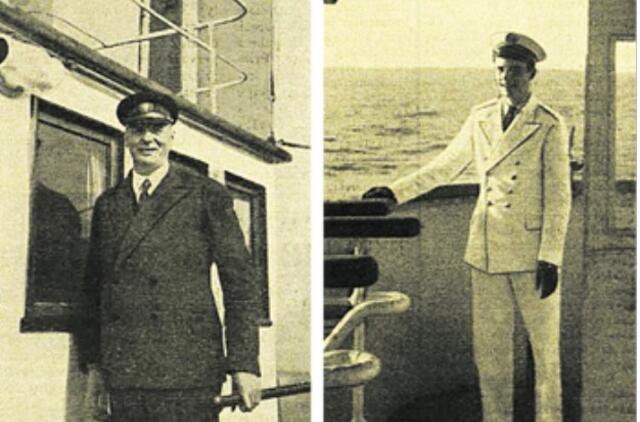 Laivo „Perkūnas“ denyje. Dešinėje jo kapitonas J. Andžejauskas, viršutinėje eilėje šalia gelbėjimosi rato jo sūnus Vytautas, pirmoje eilėje per vidurį duktė Vanda 1931 m. Lietuvos jūrų muziejaus archyvas