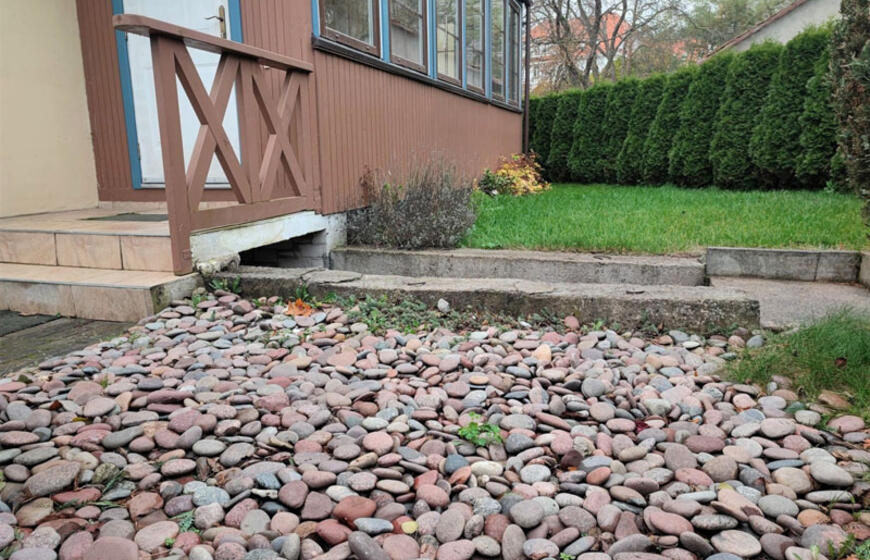 NEPAGAILĖJO. Pajūrio akmenukais Nidoje nuklota net daugiabučio namo aplinka tiesiog po balkonais.
