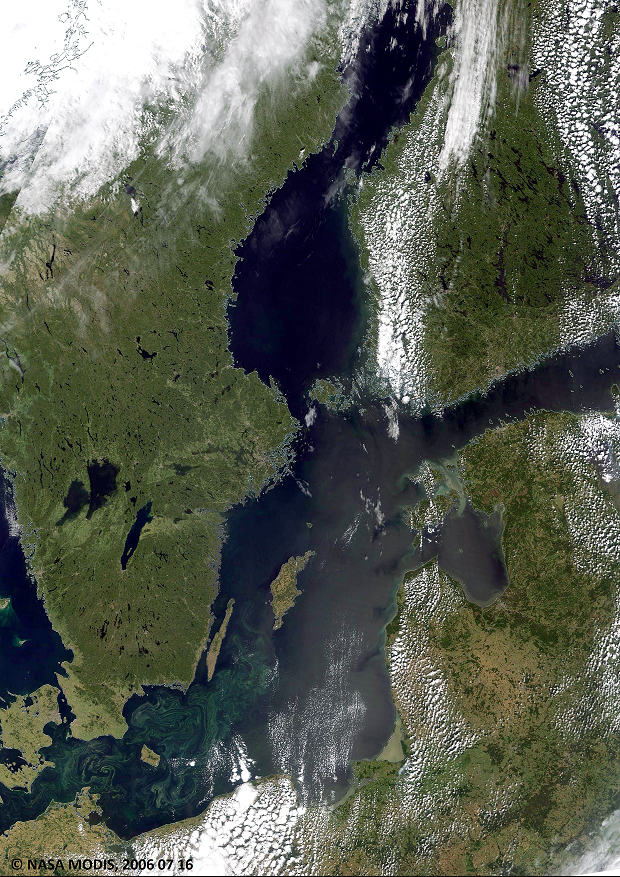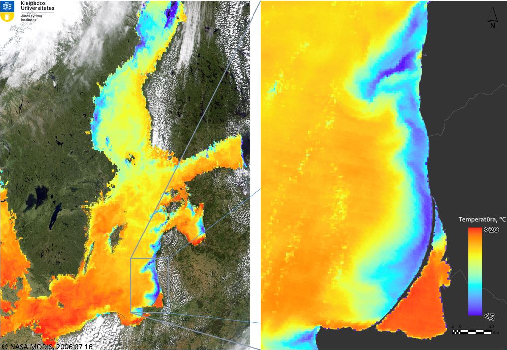 VAIZDAS. 2006 m. liepos mėnesį vykęs apvelingas Baltijos priekrantėje žvelgiant iš kosmoso (NASA Worldview Snapshots, Terra MODIS True Color Corrected Reflectance).