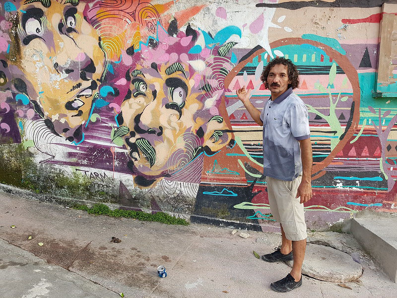 Man besimėgaujant vaizdu į sceną žengė favelų meno ekspertas, besispecializuojantis grafičių technikoje. Ir visai nesvarbu, kad aš nesuprantu portugališkai, o jis nekalba nei angliškai, nei rusiškai ar lietuviškai - intonacija ir kūno ekspresija nepaliko vietos jokiems klausimams. Nežinau, kas padėjo mums susišnekėti - jo išgertas alkoholis ar dar kokios nežinomos aplinkybės, bet mes sugebėjome išsiaiškinti, kad ant Dviejų Brolių kalno aš neužlipau, nes įėjimas užrakintas, todėl jis man siūlosi pabūti gidu ir nuvesti į viršūnę kitu keliu. Argi galima tokio pasiūlymo atsisakyti?