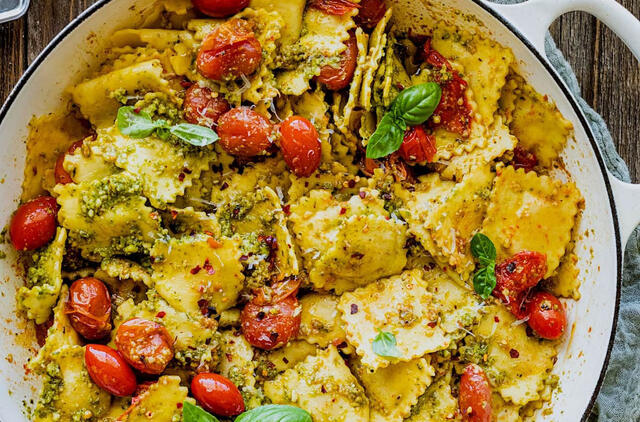 Kaitrą sumažinkite iki mažos ir į keptuvę sudėkite virtus raviolius. Švelniai įmaišykite pesto, kol ravioliai gerai pasidengs.