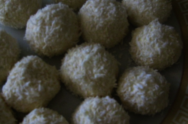 - Gerai išmaišykite, drėgnomis rankomis suformuokite rutuliukus ir apvoliokite sūrio rutuliukus kokoso drožlėse.