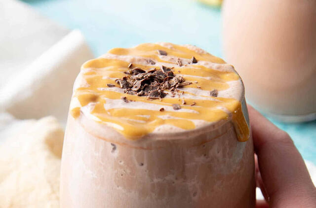 Sudėkite visus ingredientus nurodyta tvarka: Pienas, bananas, veganiški baltymų milteliai, žemės riešutų sviestas, vanilė ir ledo kubeliai. Tai yra tvarka, kuri, mano nuomone, užtikrina sklandžiausią tekstūrą, be jokių baltymų miltelių gumulėlių.