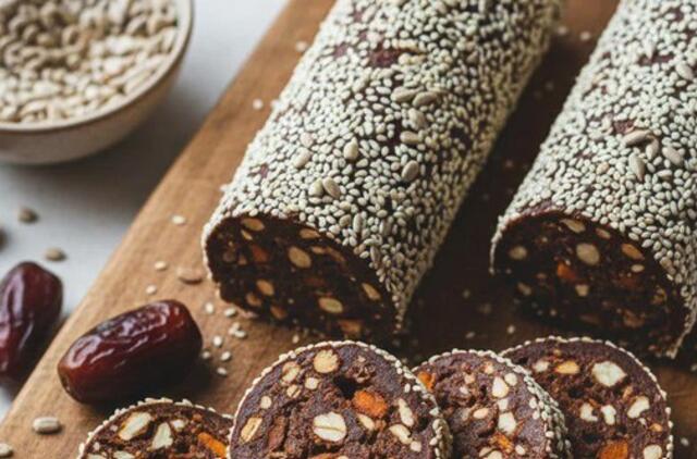 Gautą masę gerai išmaišykite iki vientisos konsistencijos. Dėl natūralaus datulių lipnumo masė lengvai formuojasi. Suformuokite klasikinę „dešrą“ ir apvoliokite ją sezamo sėklų bei saulėgrąžų mišinyje.