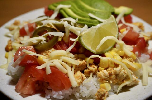 Reikės: 200 g japoniškų trumpagrūdžių ryžių, 250 g vištienos faršo, 2 pomidorų, ½ raudonojo svogūno, ½ stiklinės kukurūzų (konservuotų arba šaldytų), 100 g marinuotų Chalapos paprikų, 1 avokado, ½ žaliosios citrinos, ½ stiklinės tarkuoto sūrio, 1 šaukštelio aliejaus, 1 šaukštelio druskos, 1 šaukštelio (arba pagal skonį) čili prieskonių mišinio.