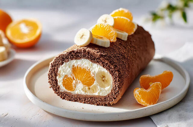 Gautą šokoladinį pagrindą iškočiokite tarp dviejų maistinės plėvelės sluoksnių į maždaug 5 mm storio kvadratą. Tolygiai aptepkite paviršių varškės kremu, palikdami po 1 cm nuo kraštų. Viename krašte išrikiuokite nuluptus sveikus mandarinus.