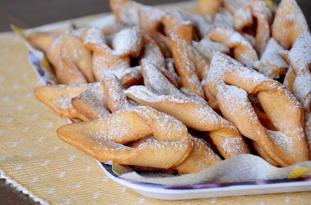 Iškočiokite tešlą į maždaug 5 mm storio lakštą. Supjaustykite kvadratėliais ar stačiakampiais, kiekvieno centre padarykite kelių centimetrų ilgio įpjovą. Per šią įpjovą perkiškite vieną tešlos gabalėlio galą, „išversdami“ jį į priešingą pusę.