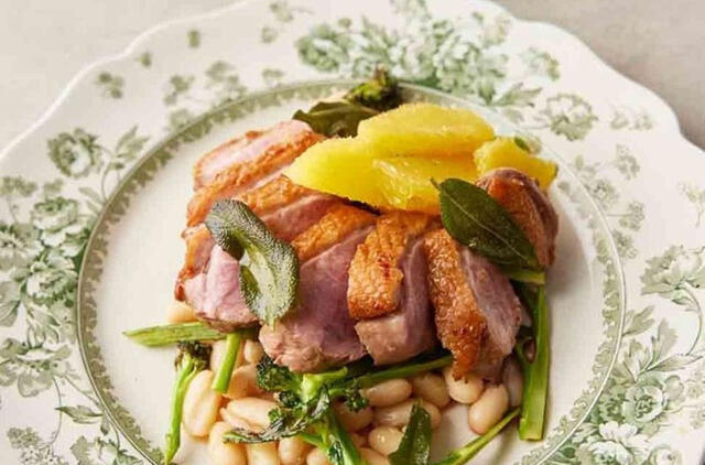 Pagardinkite iki tobulumo, padalykite į lėkštes ir apšlakstykite visas likusias sultis. Supjaustykite antį ir išdėliokite ant viršaus, išbarstykite ant traškių šalavijų ir apelsinų.