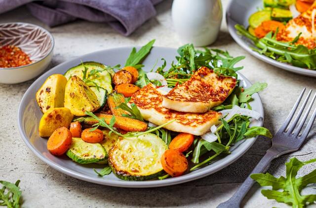 - Į atskiras lėkštes paskirstykite pjaustytą papriką, baklažano griežinėlius ir pomidorus. Įberkite alyvuogių, kaparėlių ir sudėkite „Halloumi" kepsnelius. Apšlakstykite viską alyvuogių aliejumi, užberkite druskos, pipirų, ir skanaukite!