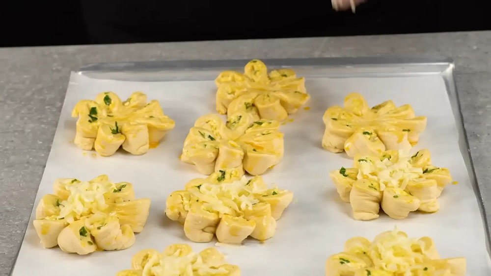 Aptepkite gėlytes plakto kiaušinio plakiniu, o į centrą įberkite dar šiek tiek tarkuoto sūrio. Kepkite orkaitėje 20–25 minutes 180 laipsnių temperatūroje.