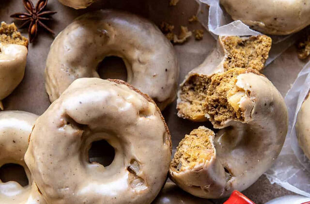 5. Tuo tarpu paruoškite glajų. Į nedidelį puodą ant vidutinės ugnies sudėkite sviestą. Leiskite sviestui šiek tiek paruduoti, kol pajusite skrudintą kvapą, apie 2-3 minutes. Nuimkite nuo ugnies ir įmaišykite klevų sirupą, cukraus pudrą, tirpią kavą ir cinamoną. Spurgas pamerkite arba apšlakstykite glajumi. Labai rekomenduojama kelias suvalgyti šiltas.