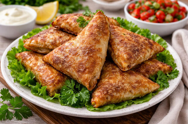 Baigiame orkaitėje: Sudėkite apkeptus trikampėlius į kepimo skardą, įpilkite 50 ml vandens, sandariai uždenkite folija ir dėkite į iki 200 laipsnių įkaitintą orkaitę. Troškinkite apie 15–20 minučių, kol mėsa viduje visiškai išvirs ir blynai taps minkšti.