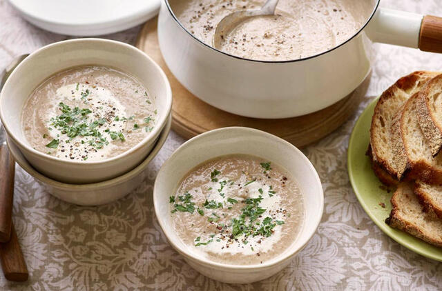 5.Grąžinkite sriubą į puodą ant vidutinės ugnies ir įmaišykite sojos padažą bei didžiąją dalį grietinėlės. Pagardinkite druska ir šviežiai maltais juodaisiais pipirais pagal skonį, tada patiekite šiltuose sriubos dubenėliuose. Apšlakstykite likusia grietinėle ir pabarstykite petražolėmis, kad užbaigtumėte patiekalą.
