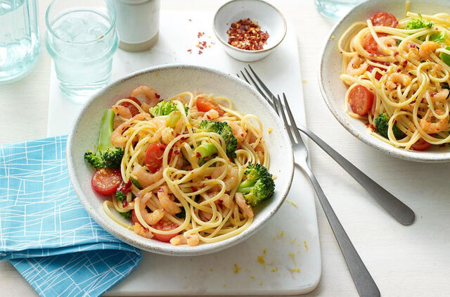Nusausinkite makaronus ir brokolius. Grąžinkite į puodą ir įpilkite pomidorų, krevečių, aliejaus, čili dribsnių ir gerai pagardinkite. Virkite 2–3 minutes, maišydami dviem medinėmis šaukštais, kol spagečiai bus tolygiai padengti puodo prieskoniais, o krevetės ir pomidorai bus karšti.