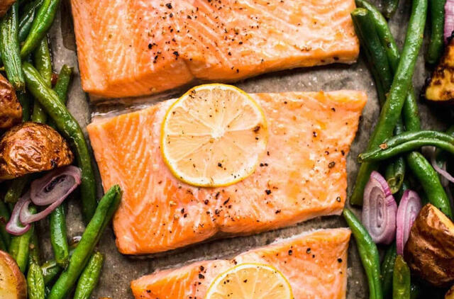 Lašiša orkaitėje su bulvėmis ir žaliomis pupelėmis (tik 5 ingredientai)