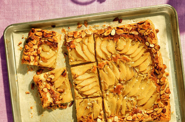 Kepant galetei, kraštas išsipūs, o migdolai apskrus, suteikdami šiam rudens desertui malonų riešutinį traškumą – nuostabų kontrastą sultingoms kriaušėms. Geriausia, kad šis desertas bus išimtas iš orkaitės ir vės, kol jūsų teta dar nebus baigusi pjaustyti vaisių savo garsiajam obuolių pyragui.