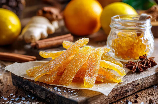 Supjaustytas žieveles (juostelėmis arba figūromis) du kartus užpilkite verdančiu vandeniu, palaikykite 10–15 min ir nupilkite. Tuomet ruoškite sirupą: į puodą pilkite 700 ml vandens, berkite 700 g cukraus, dėkite cinamono lazdelę, žvaigždanyžius, gvazdikėlius, kubeliais pjaustytą imbierą, pilkite citrinos sultis ir vanilę. Viską užvirinkite.