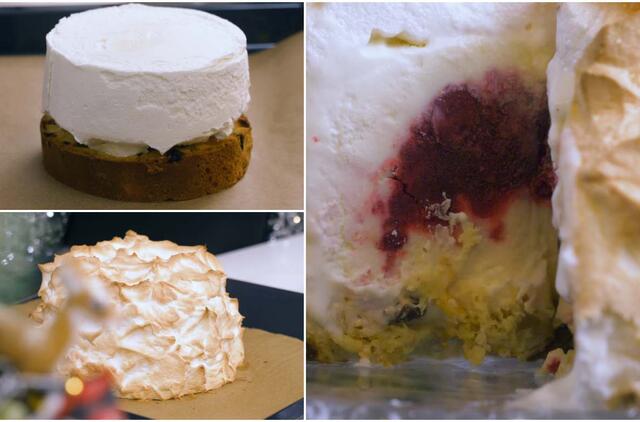 Kiaušinių baltymus išplakite su cukrumi iki standžių putų. Iš Panetone pyrago išpjaukite apskritimą, kuris taps deserto pagrindu. Į kepimo skardą įdėkite pyrago pagrindą, o ant viršaus – ledus (ledai ir pyragas turėtų būti vienodo skersmens).