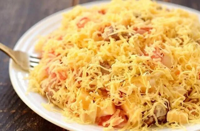 Sudėkite visus ingredientus į salotinę, pasūdykite, užpilkite majonezu ir gerai išmaišykite. Papuoškite likusiu tarkuotu kietuoju sūriu ir patiekite.