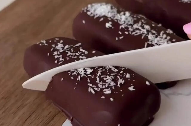 5 žingsnis. Ištirpinkite šokoladą ir į jį įdėkite kokosų aliejaus. Kiekvieną sūrelį panardinkite į šokoladą ir pabarstykite kokosų drožlėmis. Atšaldykite šaldytuve.