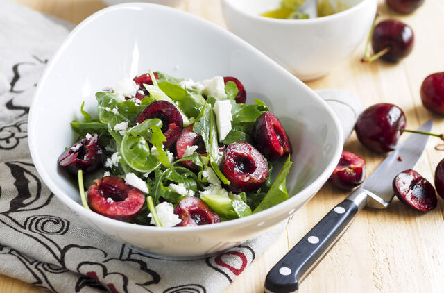 Reikės: 400 g trešnių, 200 g fetos sūrio, 4 saujų mėgstamų salotų, saujos šviežių bazilikų, keleto šviežių mėtų lapelių, 1 cukinijos (nebūtina). Padažui: sulčių, kurios ištekėjo bedarinėjant trešnes, 2 šaukštų alyvuogių aliejaus, 1 skiltelės česnako, baltojo vyno acto, šiek tiek medaus, druskos, šviežiai maltų pipirų.
