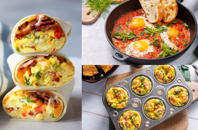 Pusryčių buritai. Iš plaktos kiaušinienės su mėgstamais priedais – grybais, paprika, kumpiu, kukurūzais – ir tortilijos galima susukti labai paprastą patiekalą. Tai gardus, sotus pasirinkimas tiek pusryčiams, tiek priešpiečiams. O jei pagaminote daugiau – buritus, kaip ir keksiukus, galima užšaldyti. Jie šaldiklyje išsilaiko kelias savaites.