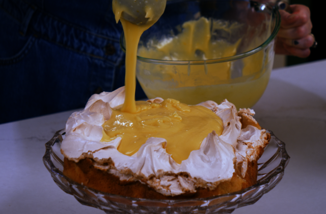 Ant iškepusio ir atvėsusio pyrago viršaus supilkite atvėsusį citrininį kremą ir uždėkite dar kelis šaukštus plaktos grietinėlės (be cukraus, nes kremas yra pakankamai saldus). Skanaus!