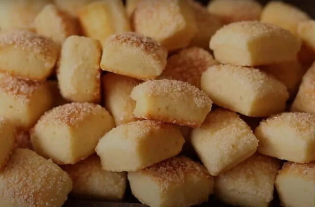 Tada įberkite išsijotų aukščiausios rūšies miltų, kepimo miltelių ir suminkykite tešlą. Susukite tešlą į pailgą formą ir supjaustykite 2 x 2 cm dydžio gabaliukus.