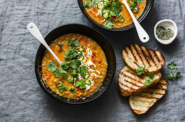 - Perkelkite viską į puodą. Įpilkite apie 600 ml vandens ir sudėkite lęšius. Virkite mišinį 30 minučių uždengę, retkarčiais pamaišydami. Išvirusią sriubą patiekite su šviežiomis petražolėmis. Jeigu norite, paskaninkite šaukšteliu grietinės arba graikiško jogurto.