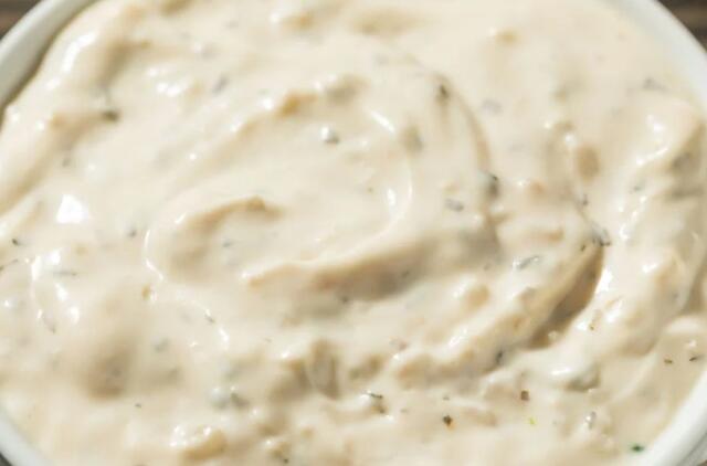 Dideliame dubenyje sumaišykite grietinę, majonezą ir atvėsusius svogūnus, kol gerai susimaišys.