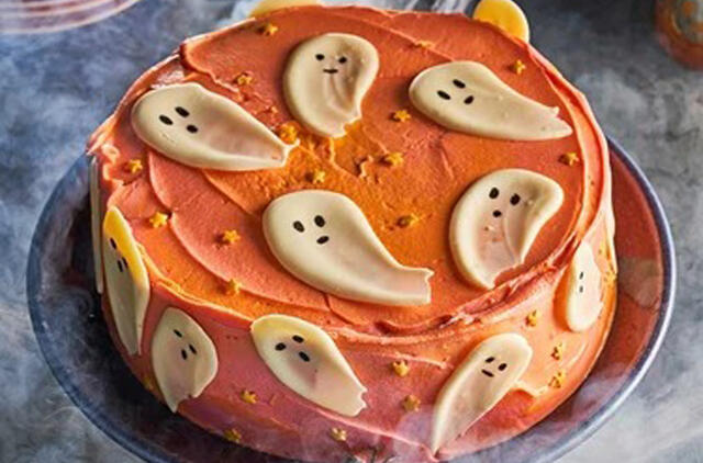 Švelniai įspauskite baisius vaiduoklius ir pabarstukus, jei naudojate, į glajų. Likęs pyragas gali būti atšaldytas sandariame inde ir laikomas šaldytuve iki trijų dienų. Galima laikyti užšaldytą, iki dviejų mėnesių.