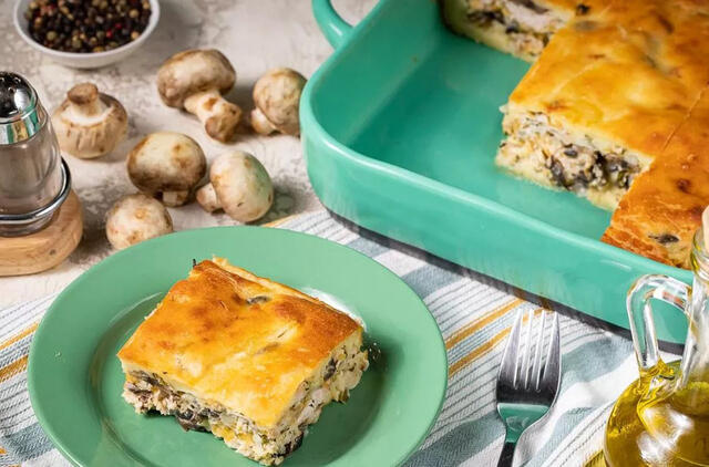 Grybus supjaustykite plonais griežinėliais ir kepkite augaliniame aliejuje 5–7 minutes. Svogūną supjaustykite mažais kubeliais, žalumynus susmulkinkite. Sūrį sutarkuokite stambia tarka.