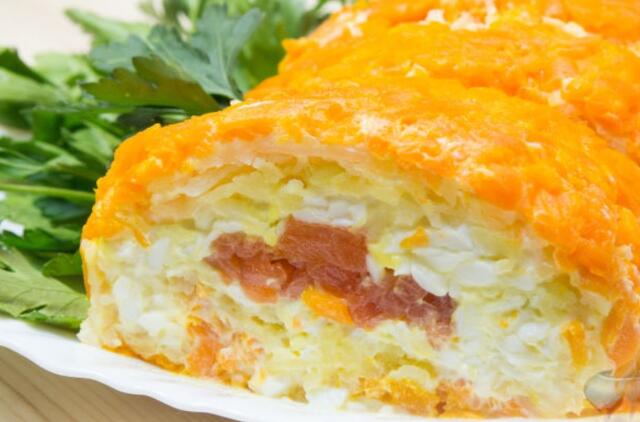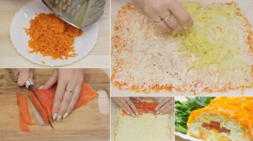 Pabaigoje lašišos raudonosios žuvies griežinėlius ir atsargiai susukite žuvies salotas į ritinėlį.