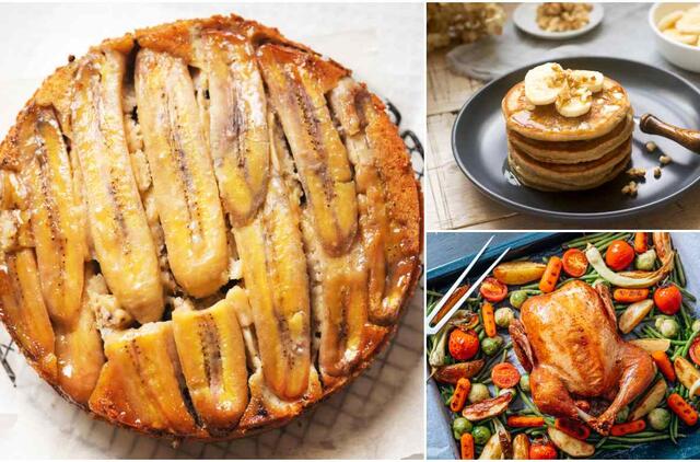 Šis pyragas kepa „aukštyn kojomis“ – dugne karamelizuojasi bananai, o viršuje iškyla drėgnas pyragas su sausainių gabaliukais.