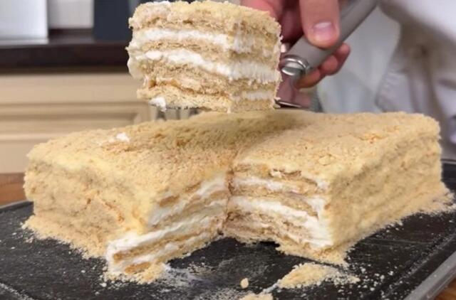 - Kai kremas paruoštas, galite iš karto sluoksniuoti tortą. Kepinių nereikia – sausainiai atstos lakštus.