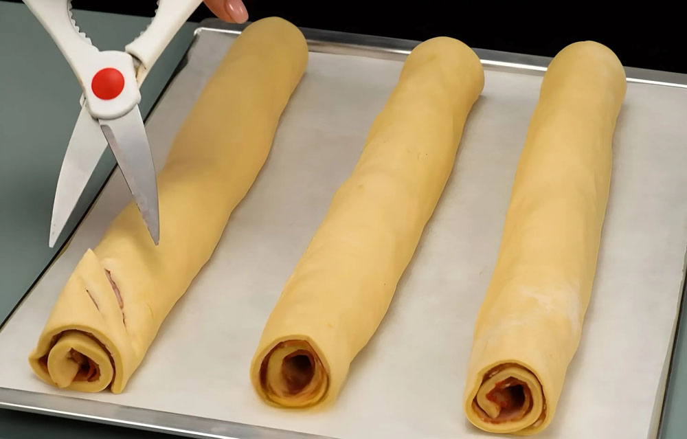 Kiekvieną dalį susukite į ritinėlį. Peiliu arba žirklėmis padarykite įpjovas, kaip parodyta nuotraukose. Gautą pynutę aptepkite išplaktu kiaušiniu.