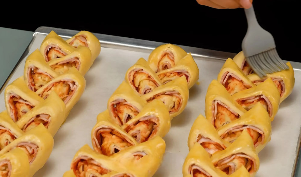 Patarimas: Įdarą galite keisti savo nuožiūra. Galite palikti paprastesnį variantą – tik su sūreliais ir padažu, arba, priešingai, papildyti pynutes užbarstydami tarkuoto sūrio.