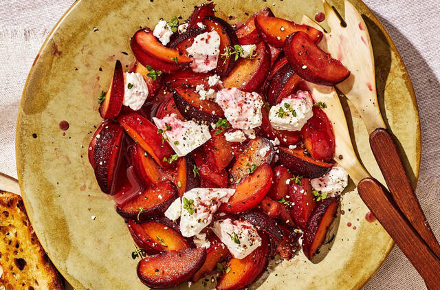 Slyvos vėlyvą vasarą bei rudenį tampa tikromis žvaigždėmis mūsų sode ir virtuvėse. Jos būna įvairių spalvų ir formų, ir yra tokios pat sudėtingos bei skanios tiek virtos, tiek žalios. Šiame recepte jos troškinamos su kvapniais kmynais, suteikiant joms subtilų pikantiškumą, kartu subalansuojant aštrų, sūrų fetos skonį.