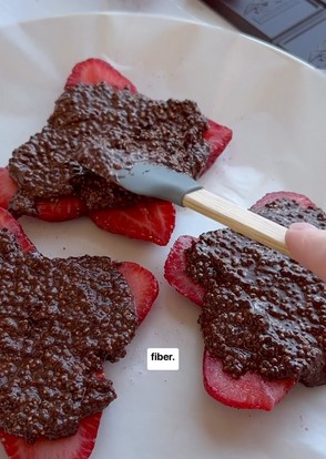 - Supjaustykite braškes ir ant viršaus užpilkite šokoladą bei kvinoją.