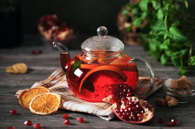 Vėsų žiemos rytą padovanokite savo skonių receptoriams gardžių skonių paletę su namine imbierų, cinamono, granatų bei aviečių arbata.