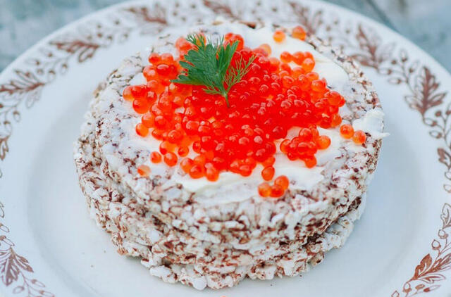 Dekoravimas: Viršų gausiai ir tolygiai padenkite raudonaisiais ikrais. Atsargiai nuimkite žiedą ir patiekite.