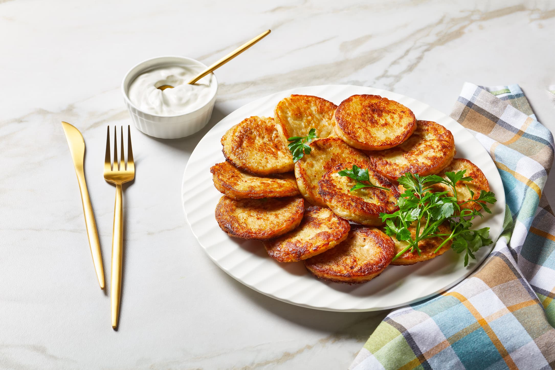 Šviežių bulvių blynai su varškės ir krapų padažu