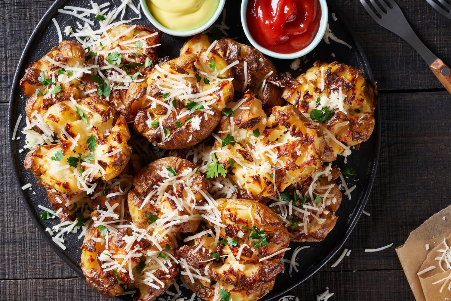 Bulves išvirkite su lupenomis. Jas dėkite į kepimo skardą, švelniai sutraiškykite šakute ar bulvių grūstuve. Apšlakstykite alyvuogių aliejumi, pabarstykite smulkintu česnaku, prieskoniais, o tada – parmezanu. Kepkite iki 200 laipsnių įkaitintoje orkaitėje apie 20 minučių, kol gražiai apskrus.